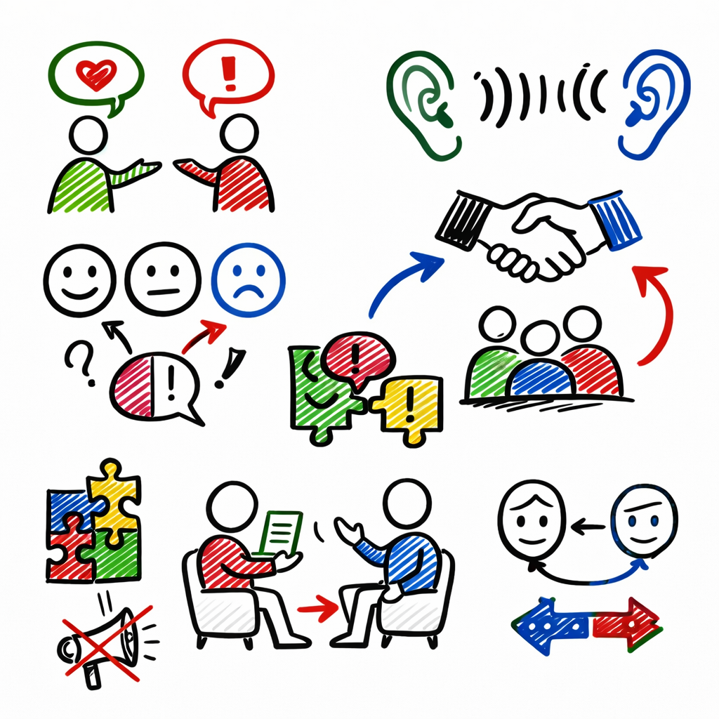 - Ćwiczenia aktywnego słuchania i empatycznego komunikowania